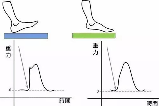 如果采用脚跟直接着地,落地时冲击力向膝盖的直接传递,无法利用脚踝的运动来进行有效的缓冲。
